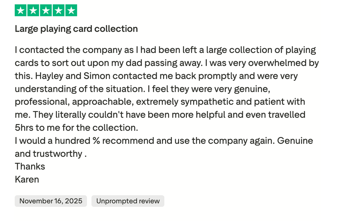 If you have a playing card collection you’re thinking about selling, we’d love to hear from you. We regularly buy collections of modern, premium playing cards, whether that’s a handful of decks or something much larger.