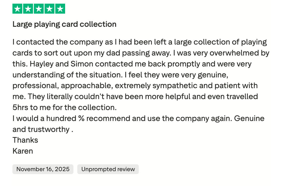 PremiumPlayingCards.co.uk is a UK-based, independent specialist in premium, collectable, and designer playing cards. We’re trusted by collectors and enthusiasts across the country, and we’d love to help you find a new home for your cards.